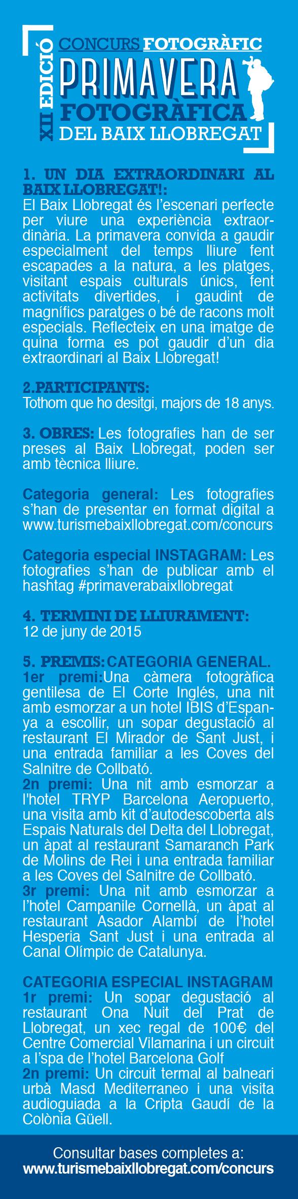 Les bases completes es poden consultar a www.turismebaixllobregat.com/concurs i al propi Consorci de Turisme del Baix Llobregat per telèfon al 93 685 24 00 ext. 552 o per email a turisme@elbaixllobregat.cat.